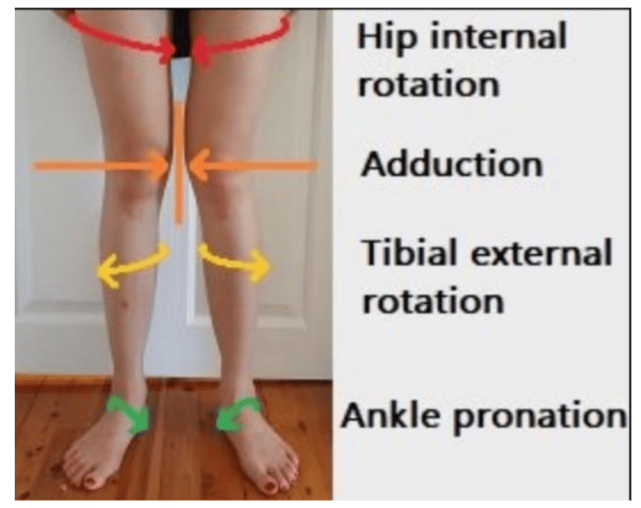 Weak hips lead to over‑adduction with internal rotation, causing the knees to cave in. The shins then have to rotate to support this knee position, and the only thing the ankles can do is pronate to keep the whole chain intact.