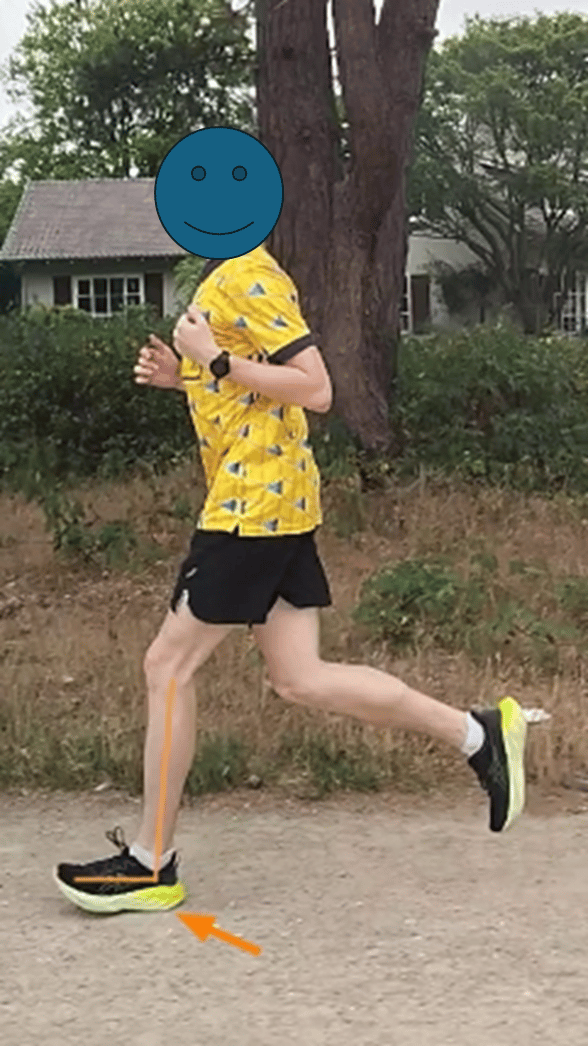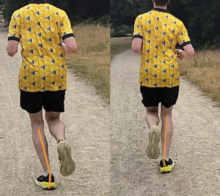 Next, I’m looking at where his foot strikes the ground. He has a back of the midfoot strike. His ankle is in a neutral 90 degree angle when he strikes the ground. This is important to know, because some shoes perform better for mid-foot or heel strikers.