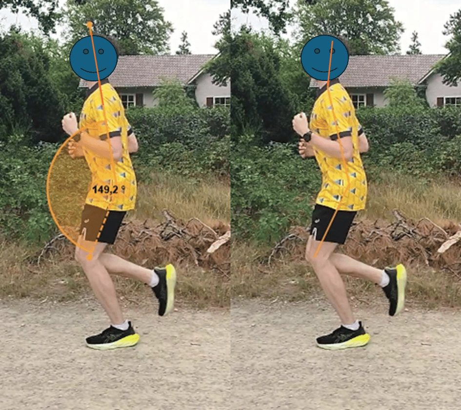 His posture is slightly ‘seated’, which results a smaller total hip angle. This angle would preferably be a bit larger, close to 170-180. This makes leaning from the ankles easier too. It also leads to compensation further up the kinetic chain. This results in him having to tilt his chin up to still keep his eyes neutral.